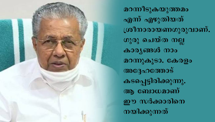 മറന്നീടുകയുത്തമം’ എന്ന് എഴുതിയത് ശ്രീനാരായണഗുരുവാണ്. ഗുരു ചെയ്ത നല്ല കാര്യങ്ങൾ നാം മറന്നുകൂടാ. കേരളം അദ്ദേഹത്തോട് കടപ്പെട്ടിരിക്കുന്നു. ആ ബോധമാണ് ഈ സർക്കാരിനെ നയിക്കുന്നത്.