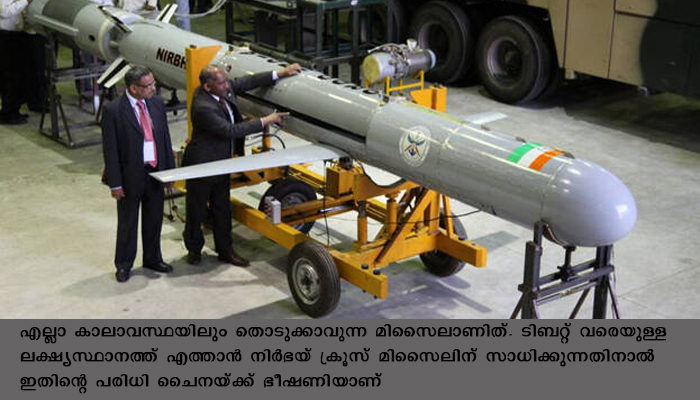 ന്യൂഡല്‍ഹി: 1,000 കിലോമീറ്റര്‍ വരെ ദൂരം സഞ്ചരിക്കാവുന്ന ഭൂതല ആണവ വാഹക ക്രൂയിസ് മിസൈലായ നിര്‍ഭയ് ചൈനീസ് അതിര്‍ത്തിയില്‍ വിന്യസിപ്പിക്കാന്‍ ഇന്ത്യ. എല്ലാ കാലാവസ്ഥയിലും തൊടുക്കാവുന്ന മിസൈലാണിത്. ടിബറ്റ് വരെയുള്ള ലക്ഷ്യസ്ഥാനത്ത് എത്താന്‍ നിര്‍ഭയ് ക്രൂസ് മിസൈലിന് സാധിക്കുന്നതിനാല്‍ ഇതിന്റെ പരിധി ചൈനയ്ക്ക് ഭീഷണിയാണ്. ഭൗമോപരിതലത്തില്‍ നിന്ന് നൂറു മീറ്റര്‍ മുതല്‍ നാലു കിലോമീറ്റര്‍ വരെ ഉയരത്തില്‍ പറക്കാനുള്ള ശേഷിയുണ്ട് ഇതിന്