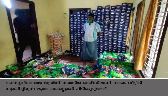 രഹസ്യവിവരത്തെ തുടര്ന്ന് നടത്തിയ റെയ്ഡിലാണ് വാടക വീട്ടില് സൂക്ഷിച്ചിരുന്ന 25,000 പാക്കറ്റുകള് പിടിച്ചെടുത്തത്. ചിറയില് വീട്ടില് നൗഷാദിന്റെ ഉടമസ്ഥതയിലുളള കെട്ടിടം വാടകയ്ക്കെടുത്താണ് പുകയില ഉത്പ്പന്നങ്ങള് സൂക്ഷിച്ചിരുന്നത്. മംഗലാപുരത്തുനിന്നും മത്സ്യം കയറ്റിവരുന്ന ഇന്സുലേറ്റഡ് വാഹനങ്ങളിലാണ് ഇവ എത്തിക്കുന്നത്. പാക്കറ്റൊന്നിന് 50 രൂപ പ്രകാരമാണ് ചില്ലറ വില്പ്പന.
