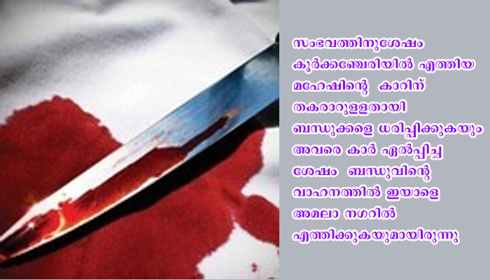 സംഭവത്തിനുശേഷം കൂര്ക്കഞ്ചേരിയില് എത്തിയ മഹേഷിന്റെ കാറിന് തക രാറുളളതായി ബന്ധുക്കളെ ധരിപ്പിക്കുകയും അവരെ കാര് ഏല്പ്പിച്ച ശേഷം ബന്ധുവിന്റെ വാഹനത്തില് ഇയാളെ അമലാ നഗറില് എത്തിക്കുകയുമായിരുന്നു. എന്നാല് കുത്തിയ വിവരം ബന്ധുക്കള് അറിഞ്ഞിരുന്നില്ല. പിന്നീടാണ് ഇയാളെ കാണാതാവുന്നത്. ഒല്ലൂര് പോലീസ് അന്വേഷണം ഊര്ജ്ജിതപ്പെടുത്തി.