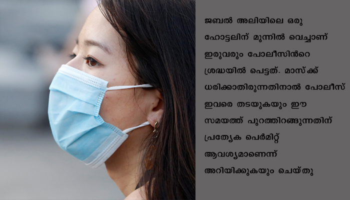 ജബല് അലിയിലെ ഒരു ഹോട്ടലിന് മുന്നില് വെച്ചാണ് ഇരുവരും പോലീസിന്റെ ശ്രദ്ധയില് പെട്ടത്. മാസ്ക്ക് ധരിക്കാതിരുന്നതിനാല് പോലീസ് ഇവരെ തടയുകയും ഈ സമയത്ത് പുറത്തിറങ്ങുന്നതിന് പ്രത്യേക പെര്മിറ്റ് ആവശ്യമാണെന്ന് അറിയിക്കുകയും ചെയ്തു. എന്നാല് തങ്ങള് നടക്കാനിറങ്ങിയതാണെന്നായിരുന്നു യുവാവിന്റെ മറുപടി. ഹോട്ടലില് വെച്ച മസാജ് ചെയ്യുന്നതിനായി 200 ദിര്ഹം നല്കിയ യുവതിയെ വിളിച്ചുവരുത്തിയതാണെന്നും ടാക്സി പണം നല്കാനായി പുറത്തിറങ്ങിയതാണെന്നും പിന്നീട് ഇയാള് പോലീസിനോട് പറഞ്ഞു.