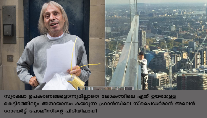 പാരിസ്: സുരക്ഷാ ഉപകരണങ്ങളൊന്നുമില്ലാതെ ലോകത്തിലെ ഏത് ഉയരമുള്ള കെട്ടിടത്തിലും അനായാസം കയറുന്ന ഫ്രാന്സിലെ സ്പൈഡര്മാന് അലെന് റോബര്ട്ട് പോലീസിന്റെ പിടിയിലായി. ജര്മനിയിലെ ഫ്രാങ്ക്ഫര്ട്ടിലുള്ള സ്കൈപകര് ടവറില് വലിഞ്ഞു കയറിയതിനാണ് റോബള്ടിനെ പൊലീസ് കസ്റ്റഡിയിലെടുത്തത്.അനുമതിയോ സുരക്ഷാ ഉപകരണങ്ങളോ ഇല്ലാതെ അരമണിക്കൂറിനുള്ളില് 154 മീറ്റര് (500 അടി), 42 നില കെട്ടിടത്തിന്റെ മുകളില് എത്തിയ റോബര്ട്ട് അലൈനെ മുകളില് എത്തിയതിനു ശേഷം പൊലീസ് അറസ്റ്റ് ചെയ്യുകയായിരുന്നു. അനുവാദമോ വേണ്ടത്ര സുരക്ഷാ ഉപകരണങ്ങളോ ഇല്ലാതെ കെട്ടിടത്തിനു മുകളില് കയറിയതിനാണ് അറസ്റ്റ്.