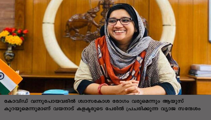 വയനാട്: വയനാട് ജില്ലാകളക്ടറുടെ സുപ്രധാന സന്ദേശം എന്ന പേരില് സമൂഹ മാദ്ധ്യങ്ങളിലൂടെ പരക്കുന്നത് തന്റേതല്ലാത്തതെന്ന് ജില്ലാ കളക്ടര് ഡോക്ടര് അദീലാ അബ്ദുളള. കോവിഡ് വന്നുപോയവരില് ശ്വാസകോശ രോഗം വരുമെന്നും ആയുസ് കുറയുമെന്നുമാണ് വയനാട് കളക്ടരുടെ പേരില് പ്രചരിക്കുന്ന വ്യാജ സന്ദേശം. പിന്നീട് ശ്വാസ കോശത്തിന് വലിയ മാറ്റമുണ്ടാവുമെന്നും ആയുസ് കുറയുമെന്നുമാണ് ശാസ്ത്രീയ അടിത്തറയൊന്നുമില്ലാത്ത സന്ദേശത്തിന്റെ ഉളളടക്കം.