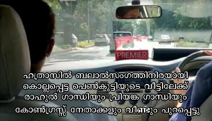 ന്യൂഡൽഹി: ഉത്തർപ്രദേശിലെ ഹത്രാസിൽ ബലാൽസംഗത്തിനിരയായി കൊല്ലപ്പെട്ട പെൺകുട്ടിയുടെ വീട്ടിലേക്ക് രാഹുൽ ഗാന്ധിയും പ്രിയങ്ക ഗാന്ധിയും കോൺഗ്രസ്സ് നേതാക്കളും വീണ്ടും പുറപ്പെട്ടു. 03/10/20 ശനിയാഴ്ച ഉച്ചയോടെയാണ് എ ഐ സി സി ആസ്ഥാനത്തു നിന്നും നേതാക്കൾ പുറപ്പെട്ടത്. പ്രിയങ്ക ഓടിയ്ക്കുന്ന കാറിലാണ് രാഹുൽ ഗാന്ധിയുള്ളത്.