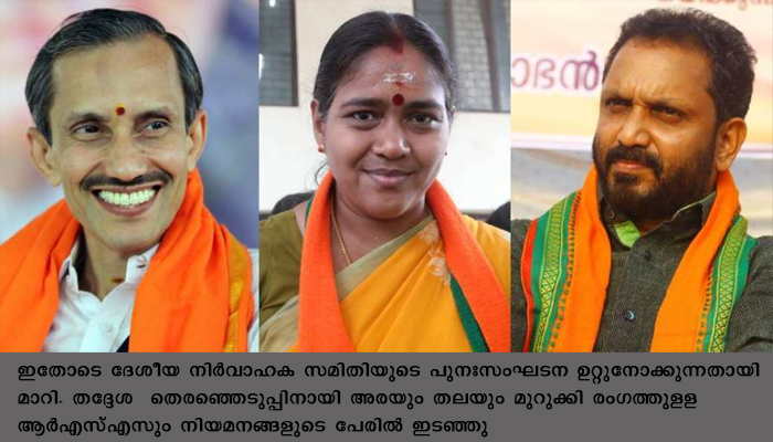 വി മുരളീധരന്‍ പക്ഷത്തുളള കെ സുരേന്ദ്രന്‍ പ്രസിഡന്‍റായതോടെ പികെ കൃഷ്ണദാസ് പക്ഷത്തുണ്ടായ അസ്വാരസ്യങ്ങളാണ് വീണ്ടും തലപൊക്കിയത്. എപി അബ്ദുളളക്കുട്ടിയെ ദേശീയ വൈസ് പ്രസിഡന്‍റാക്കിയതും, , ടോം വടക്കനെ വക്താവാക്കിയതും കേരള നേതൃത്വത്തെ ഞെട്ടിച്ചു. കോണ്‍ഗ്രസില്‍ നിന്നുവന്ന ഈ രണ്ടുപേര്‍മാത്രം പരിഗണിക്കപ്പെട്ടപ്പോള്‍ കേരളത്തില്‍ പദവികള്‍ പ്രതീക്ഷിച്ചിരുന്നവര്‍ നിരാശരായി. കുമ്മനം രാജശേഖരന്‍ വീണ്ടും തഴയപ്പെട്ടതാണ് ആര്‍എസ്എസിനെ ചൊടിപ്പിച്ചത്.