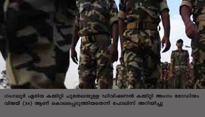 പോലീസിനായി ചാരപ്പണി നടത്തിയെന്ന് സംശയിക്കുന്ന വിജയുമായി സംഘാംഗങ്ങള് വഴക്കുണ്ടാക്കുകയായിരുന്നു. തുടര്ന്ന് ഡെപ്യൂട്ടി കമാന്ഡറുടെ നിര്ദേശ പ്രകാരം കിരണ്ടൂളിനും ഗംഗലൂരിനും ഇടയിലുള്ള വനപ്രദേശത്ത് വച്ച് ഇയാളെ കൊല്ലുകയായിരുന്നുവെന്നും പോലിസ് പറഞ്ഞു. മോഡിയം വിജയ്ക്കെതിരേ വിവിധ കേസുകളിലായി പോലിസ് 18 ലധികം എഫ്ഐആര് രജിസ്റ്റര് ചെയ്തിട്ടുണ്ട്. എട്ട് ലക്ഷം രൂപ തലയ്ക്ക് പാരിതോഷികം പ്രഖ്യാപിക്കപ്പെട്ട കുറ്റവാളിയുമാണ് ഇയാള്.