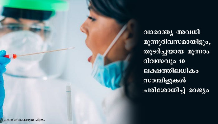 വാരാന്ത്യ അവധി മൂന്നുദിവസമായിട്ടും, തുടര്ച്ചയായ മൂന്നാം ദിവസവും 10 ലക്ഷത്തിലധികം സാമ്പിളുകള് പരിശോധിച്ച് രാജ്യം
