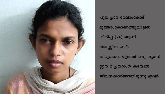 പാലോട്: കുട്ടിയുടെ മാല കവര്ന്ന കേസില് സ്ത്രീയെ പോലോട് പോലീസ് അറസ്റ്റ് ചെയ്തു. വീടുകളില് ഗ്യാസ് സ്റ്റൗ റിപ്പയര് ചെയ്യാനെത്തിയതിനിടയിലാണ് മാല കവര്ന്നത്. പുലിപ്പാറ മേലാംകോട് മൂത്താംകോണത്തുവീട്ടില് ശില്പ്പ (24) ആണ് അറസ്റ്റിലായത്. തിരുവനന്തപുരത്ത് ഒരു ഗ്യാസ് സ്റ്റൗ റിപ്പയറിംഗ് കടയില് ജീവനക്കാരിയായിരുന്നു ഇവര്. ഇവിടെ നിന്ന് മാറിയ ശേഷം വിവിധ ഗ്യാസ് ഏജന്സികളുടെ പേരില് വീടുകളില് എത്തി ഗ്യാസ് സ്റ്റൗ റിപ്പയറിംഗ് നടത്തിവരുകയായിരുന്നു.