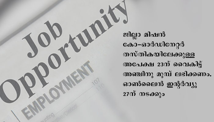 അസി. ജില്ലാ മിഷൻ കോ-ഓർഡിനേറ്റർ തസ്തികയിലേക്കുള്ള അപേക്ഷ 23ന് വൈകിട്ട് അഞ്ചിനു മുമ്പ് ലഭിക്കണം. ഓൺലൈൻ ഇന്റർവ്യൂ 27ന് നടക്കും. ഇന്റർവ്യൂവിന് പ്രത്യേകം കത്ത് നൽകില്ല. അപേക്ഷയിൽ മൊബൈൽ നമ്പർ, ഇ-മെയിൽ ഐഡി എന്നിവ രേഖപ്പെടുത്തണം.