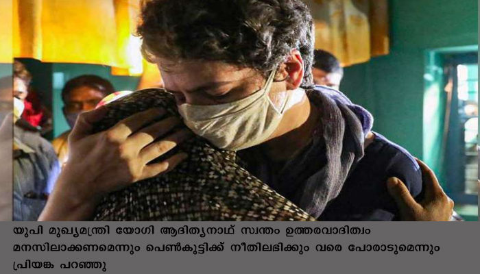 ഹാത്രാസിലെത്തിയ പ്രിയങ്കയും രാഹുലും പെണ്‍കുട്ടിയുടെ ദുഃഖാര്‍ത്ഥരായ കുടുംബത്തെ കണ്ട് ആശ്വസിപ്പിച്ചു. മകളെയോര്‍ത്ത് വിലപിക്കുന്ന പെണ്‍കുട്ടിയുടെ അമ്മയെ ആലിംഗനം ചെയ്തുകൊണ്ടാണ് പ്രിയങ്ക അവരെ ആശ്വസിപ്പിച്ചത്. പുറം ലോകവുമായുളള എല്ലാബന്ധവും വിലക്കി തടങ്കലിലെന്നപോലെയാണ് കുറെ ദിവസങ്ങളായി അവര്‍ കഴിഞ്ഞിരുന്നത്. ആ ആലിംഗനത്തിലൂടെ ഒരു രാജ്യം മുഴുവനും അവരോടൊപ്പം ഉണ്ടെന്നും അവര്‍ തനിച്ചല്ലെന്നും അവരെ ഓര്‍മ്മപ്പെടുത്തുകയായിരുന്നു. അതുകൊണ്ടുതന്നെയാണ് പ്രിയങ്ക പെണ്‍കുട്ടിയുടെ അമ്മയെ ആലിംഗനം ചെയ്ത് നില്‍ക്കുന്ന ചിത്രം സാമൂഹ മാധ്യമങ്ങളില്‍ കക്ഷി രാഷ്ട്രീയ ഭേതമെന്യെ പങ്കുവയ്ക്കപ്പെട്ടത്.