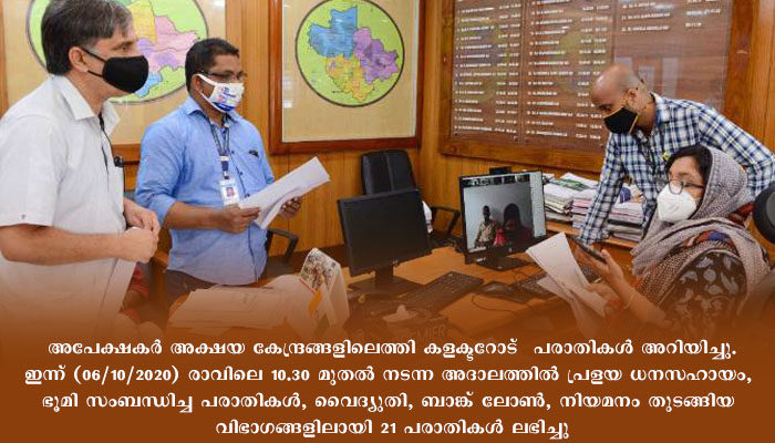 കളക്ട്രേറ്റില് നടന്ന ഓണ്ലൈന് അദാലത്തില് ഡെപ്യൂട്ടി കളക്ടര് സി.എം വിജയലക്ഷ്മി, വിവിധ വകുപ്പ്തല ഉദ്യോഗസ്ഥര് തുടങ്ങിയവര് പങ്കെടുത്തു.