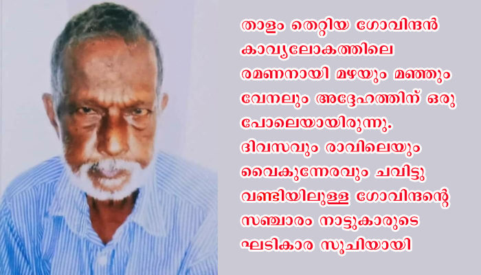 താളം തെറ്റിയ ഗോവിന്ദൻ കാവ്യലോകത്തിലെ രമണനായി. ജീവിതാന്ത്യ ത്തോളം തന്റെ പ്രണയിനി കാത്തു നിൽക്കുന്നുണ്ടെന്ന സങ്കല്പത്തിൽ വെള്ളൂരിലെ ഉപ്പുകാരൻ കണ്ണന്റെ പീടിക മുതൽ കരിവെള്ളൂർ പാലക്കുന്ന് പാട്ടിയമ്മ സ്ക്കൂൾ ഇറക്കത്തിലെ കാമുകീഭവനം വരെ ദേശീയപാതയിലൂടെ പഞ്ചറൊട്ടിച്ച സൈക്കിളിൽ അദ്ദേഹം സദാ ചവിട്ടി ചവിട്ടി മരിച്ചു.