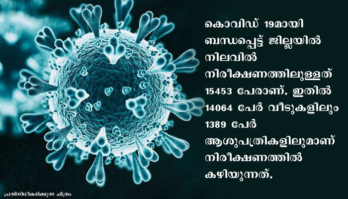 കൊവിഡ് 19മായി ബന്ധപ്പെട്ട് ജില്ലയില് നിലവില് നിരീക്ഷണത്തിലുള്ളത് 15453 പേരാണ്. ഇതില് 14064 പേര് വീടുകളിലും 1389 പേര് ആശുപത്രികളിലുമാണ് നിരീക്ഷണത്തില് കഴിയുന്നത്.