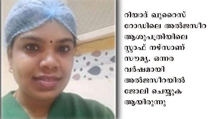റിയാദ്- ഖുറൈസ് റോഡിലെ അൽജസീറ ആശുപത്രിയിലെ സ്റ്റാഫ് നഴ്സാണ് സൗമ്യ. ഒന്നരവർഷമായി അൽജസീറയിൽ ജോലി ചെയ്യുകയായിരുന്നു.