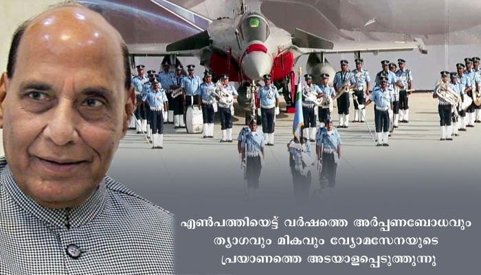 ഇളം നീലക്കുപ്പായമണിഞ്ഞ പുരുഷന്മാരെയും സ്ത്രീകളെയും പറ്റി അഭിമാനിക്കുന്നുവെന്ന് വ്യോമ സേനാംഗങ്ങളെ പരാമർശിച്ചു കൊണ്ട് അദ്ദേഹം പറഞ്ഞു. വെല്ലുവിളികൾ നേരിടാനും എതിരാളികളെ പിന്തിരിപ്പിക്കാനുമുള്ള വ്യോമസേനയുടെ ശേഷിയെ പ്രണമിക്കുന്നുവെന്നും രാജ്യ രക്ഷാ മന്ത്രി കൂട്ടിച്ചേർത്തു.