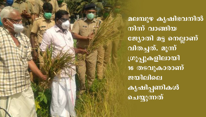 മലമ്പുഴ കൃഷിഭവനില് നിന്ന് വാങ്ങിയ ജ്യോതി മട്ട നെല്ലാണ് വിതച്ചത്. മൂന്ന് ഗ്രൂപ്പുകളിലായി 16 തടവുകാരാണ് ജയിലിലെ കൃഷിപ്പണികള് ചെയ്യുന്നത്.കൂടാതെ ജയിലില് പൂച്ചെടികള്, പച്ചക്കറികള്, കിഴങ്ങ് വര്ഗങ്ങള്, പഴവര്ഗങ്ങള്, തെങ്ങ് ഉള്പ്പെടെയുള്ളവ കൃഷിചെയ്യുന്നുണ്ട്. 127 രൂപയാണ് ഓരോ തടവുകാരനും ദിവസക്കൂലിയായി നല്കുന്നത്. കൂലി തടവുകാരുടെ ബാങ്ക് അക്കൗണ്ടിലേക്ക് ജയില് ഉദ്യോഗസ്ഥര് നിക്ഷേപിക്കുന്നുണ്ട്. ഇതുപയോഗിച്ച് കേസിന്റെ നടത്തിപ്പിനും മറ്റു വീട്ടുചെലവുകള്ക്കും പണം അയക്കാന് കഴിയുന്നതിന്റെ സന്തോഷവും തടവുകാര്ക്കുണ്ട്. കൃഷി പണിയിലും പൂന്തോട്ട പരിപാലനത്തിലും ഏര്പ്പെടുന്ന തടവുകാര്ക്ക് മറ്റുള്ള തടവുകാരെ അപേക്ഷിച്ച് കൂടുതല് മാനസികവും ശാരീരികവുമായ ആരോഗ്യവും ഉന്മേഷവും ഉണ്ടെന്ന് ജയില് ഉദ്യോഗസ്ഥര് സാക്ഷ്യപ്പെടുത്തുന്നു.