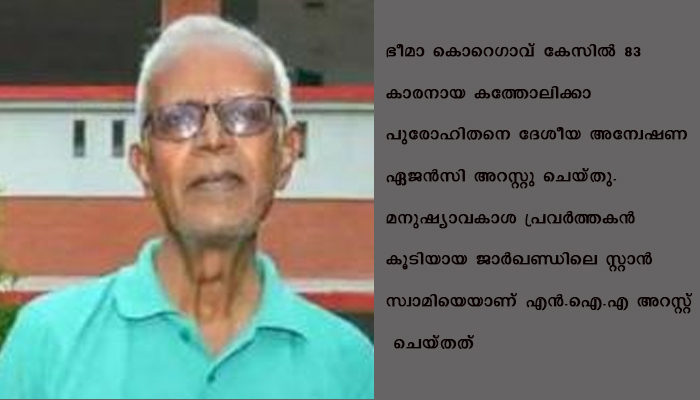 റാഞ്ചി: ഭീമാ കൊറെഗാവ് കേസിൽ 83 കാരനായ കത്തോലിക്കാ പുരോഹിതനെ ദേശീയ അന്വേഷണ ഏജൻസി അറസ്റ്റു ചെയ്തു .മനുഷ്യാവകാശ പ്രവര്ത്തകൻ കൂടിയായ ജാർഖണ്ഡിലെ സ്റ്റാന് സ്വാമിയെയാണ് എന്.ഐ.എ അറസ്റ്റ് ചെയ്തത്.