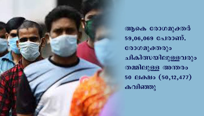 ആകെ രോഗമുക്തര് 59,06,069 പേരാണ്. രോഗമുക്തരും ചികിത്സയിലുള്ളവരും തമ്മിലുള്ള അന്തരം 50 ലക്ഷം (50,12,477) കവിഞ്ഞു.