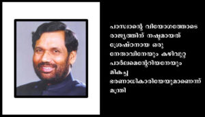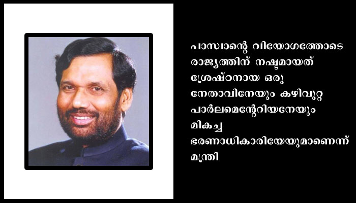 പാസ്വാന്റെ വിയോഗത്തോടെ രാജ്യത്തിന് നഷ്ടമായത് ശ്രേഷ്ഠനായ ഒരു നേതാവിനേയും കഴിവുറ്റ പാർലമെന്റേറിയനേയും മികച്ച ഭരണാധികാരിയേയുമാണെന്ന് മന്ത്രി സഭ പ്രമേയത്തിൽ അഭിപ്രായപ്പെട്ടു. ദുരിതമനുഭവിക്കുന്നവരുടെ ശബ്ദമായി മാറിയ പസ്വാൻ സമൂഹത്തിലെ പാർശ്വവൽക്കരിക്കപ്പെട്ടവരുടെ പ്രശ്നങ്ങൾ മുഖ്യധാരയിലേക്ക് കൊണ്ടുവരാൻ പ്രവർത്തിച്ചിരുന്നതായും പ്രമേയത്തിൽ പറയുന്നു.