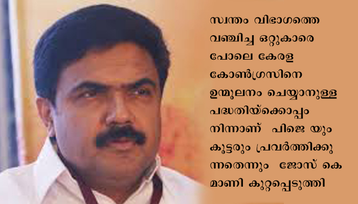 സ്വന്തം വിഭാഗത്തെ വഞ്ചിച്ച ഒറ്റുകാരെ പോലെ കേരള കോണ്ഗ്രസിനെ ഉന്മൂലനം ചെയ്യാനുള്ള പദ്ധതിയ്ക്കൊപ്പം നിന്നാണ് പിജെ യും കൂട്ടരും പ്രവര്ത്തിക്കുന്നതെന്നും ജോസ് കെ മാണി കുറ്റപ്പെടുത്തി.യോഗത്തിൽ കോണ്ഗ്രസിനെതിരെയും കടുത്ത വിമർശനം ഉയര്ന്നു.