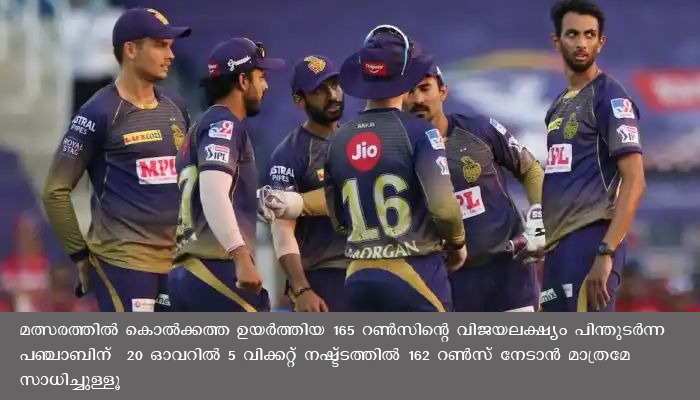 ഷാർജ: അവസാന പന്തു വരെ ആവേശം നിറഞ്ഞു നിന്ന മൽസരത്തിൽ കൊൽക്കത്ത നൈറ്റ് റൈഡേഴ്സിനു വിജയം. കിങ്സ് ഇലവന് പഞ്ചാബിനെതിരെ 2 റണ്ണുകൾക്ക് കൊല്ക്കത്ത നൈറ്റ് റൈസേഴ്സ് ജയിച്ചു. മത്സരത്തില് കൊല്ക്കത്ത ഉയര്ത്തിയ 165 റണ്സിന്റെ വിജയലക്ഷ്യം പിന്തുടര്ന്ന പഞ്ചാബിന് 20 ഓവറില് 5 വിക്കറ്റ് നഷ്ട്ടത്തില് 162 റണ്സ് നേടാൻ മാത്രമേ സാധിച്ചുള്ളൂ.
