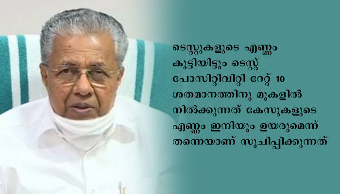 തിരുവനന്തപുരം: ഒക്ടോബർ, നവംബർ മാസങ്ങൾ കേരളത്തിലെ കോവിഡ് വ്യാപനത്തേയും അതുമൂലമുള്ള മരണ നിരക്കിനേയും സംബന്ധിച്ച് ഏറ്റവും നിർണ്ണായകമായ ഘട്ടമാണെന്ന് മുഖ്യമന്ത്രി പിണറായി വിജയൻ പറഞ്ഞു. ഈ മാസങ്ങളിൽ കൂടുതൽ ഫലപ്രദമായി പ്രതിരോധ പ്രവർത്തനങ്ങൾ നടത്താൻ നമുക്ക് കഴിയണം. എങ്കിൽ മരണങ്ങൾ അധികമാകുന്നത് വലിയ തോതിൽ തടയാൻ സാധിക്കും. പതിനായിരത്തിനു മുകളിൽ ഒരു ദിവസം കേസുകൾ വരുന്ന സാഹചര്യമാണിപ്പോൾ. ടെസ്റ്റുകളുടെ എണ്ണം കൂട്ടിയിട്ടും ടെസ്റ്റ് പോസിറ്റിവിറ്റി റേറ്റ് 10 ശതമാനത്തിനു മുകളിൽ നിൽക്കുന്നത് കേസുകളുടെ എണ്ണം ഇനിയും ഉയരുമെന്ന് തന്നെയാണ് സൂചിപ്പിക്കുന്നത്.