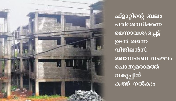 തൃശൂർ: ലൈഫ് മിഷന് ക്രമക്കേട് അന്വേഷിക്കുന്ന വിജിലന്സ് സംഘം ഫ്ളാറ്റിന്റെ ബലപരിശോധന നടത്താൻ നീക്കം. ഫ്ളാറ്റിന്റെ ബലം പരിശോധിക്കണമെന്നാവശ്യപ്പെട്ട് ഉടന് തന്നെ വിജിലന്സ് അന്വേഷണ സംഘം പൊതുമരാമത്ത് വകുപ്പിന് കത്ത് നല്കും. ഇതിന് മുന്നോടിയായി ക്രമക്കേടുകളെ കുറിച്ച് കൂടുതൽ വിവരങ്ങൾ ശേഖരിക്കാൻ 12 -10 -2020 തിങ്കളാഴ്ച വടക്കാഞ്ചേരിയിൽ പദ്ധതി പ്രദേശത്ത് നേരിട്ടെത്തും.