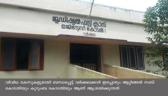 വര്ക്കല: ആറുപതിറ്റാണ്ടിലധികമായി വര്ക്കലയില് പ്രവര്ത്തിക്കുന്ന മുന്സിഫ് കോടതിയും മജിസ്ട്രേറ്റ് കോടതിയും അടിസ്ഥാന സൗകര്യങ്ങളുടെ അഭാവവം നിമിത്തം വീര്പ്പുമുട്ടുന്നു. വര്ക്കല താലൂക്കായി മാറിയശേഷവും യാതൊരുവിധ സൗകര്യങ്ങളും ഏര്പ്പെടുത്തിയട്ടില്ല. വിവിധ കേസുകളുമായി ബന്ധപ്പെട്ട് വര്ക്കലക്കാര് ഇപ്പോഴും ആറ്റിങ്ങല് സബ് കോടതിയും കുടുംബ കോടതിയും ആണ് ആശ്രയിക്കുന്നത്. ആറ്റിങ്ങല് കോടതികളില് നിലവിലുളള കേസുകളില് ഭൂരിഭാഗവും വാര്ക്കല താലൂക്ക് നിവാസികളുടേതാണ് .