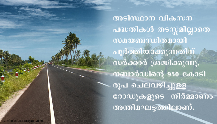 പ്രളയകാലത്ത് തകര്ന്ന റോഡുകളുടെ ഉപരിതലം നവീകരിക്കുന്നതിനായി 1883 കോടി രൂപയാണ് സര്ക്കാര് ചെലവഴിച്ചത്. അടിസ്ഥാന വികസന പദ്ധതികള് തടസ്സമില്ലാതെ സമയബന്ധിതമായി പൂര്ത്തിയാക്കുന്നതിന് സര്ക്കാര് ശ്രദ്ധിക്കുന്നു. നബാര്ഡിന്റെ 950 കോടി രൂപ ചെലവഴിച്ചുള്ള റോഡുകളുടെ നിര്മ്മാണം അന്തിമഘട്ടത്തിലാണ്.