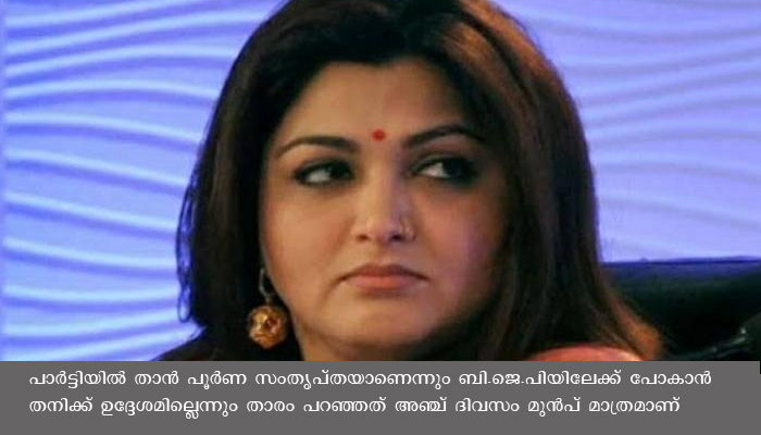 പാര്ട്ടിയില് താന് പൂര്ണ സംതൃപ്തയാണെന്നും ബി.ജെ.പിയിലേക്ക് പോകാന് തനിക്ക് ഉദ്ദേശമില്ലെന്നും താരം പറഞ്ഞത് അഞ്ച് ദിവസം മുൻപ് മാത്രമാണ്. കോണ്ഗ്രസ് പാര്ട്ടി വിടാന് പോകുന്നു എന്ന അഭ്യൂഹങ്ങള് തള്ളി താന് പാര്ട്ടി വിടാന് ഉദ്ദേശിച്ചിട്ടില്ല എന്ന നിലപാടാണ് ഖുശ്ബു അന്ന് സ്വീകരിച്ചിരുന്നത്.