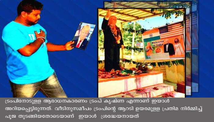 ട്രംപിന് കോവിഡ് ബാധിച്ചതുമുതല് കൃഷ്ണ അസ്വസ്ഥനായിരുന്നെന്ന് ബന്ധുക്കള് പറഞ്ഞു. ട്രംപിനോടുളള ആരാധനകാരണം ട്രംപ് കൃഷ്ണ എന്നാണ് ഇയാള് അറിയപ്പെട്ടിരുന്നത്. വീടിനുസമീപം ട്രംപിന്റെ ആറടി ഉയരമുളള പ്രതിമ നിര്മ്മിച്ച് പൂജ തുടങ്ങിയതോടെയാണ് ഇയാള് ശ്രദ്ധേയനായത്.