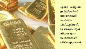 13 – 10 – 2020 ചൊവ്വഴ്ച പുലര്ച്ചെ 1.10ന് ഷാർജയിൽ നിന്നും നെടുമ്പാശേരിയിലെത്തിയ എയര് അറേബ്യ വിമാനത്തിലെ യാത്രക്കാരനായിരുന്ന മലപ്പുറം സ്വദേശി മുഹമ്മദ് അഷ്റഫ് മൊയ്തീനാണ് സ്വര്ണവുമായി പിടിയിലായത്. സ്വർണം ശരീരത്തില് ഒളിപ്പിച്ച് കടത്താന് ശ്രമിക്കുകയായിരുന്നു.