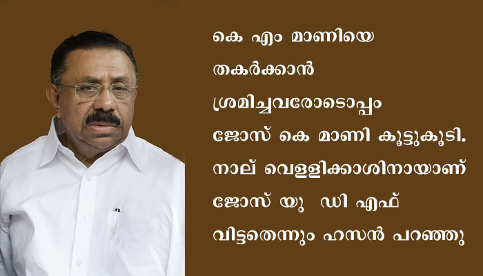 കെ എം മാണിയെ തകർക്കാൻ ശ്രമിച്ചവരോടൊപ്പം ജോസ് കെ മാണി കൂട്ടുകൂടി . നാല് വെളളിക്കാശിനായാണ് ജോസ് യു ഡി എഫ് വിട്ടതെന്നും ഹസൻ പറഞ്ഞു.