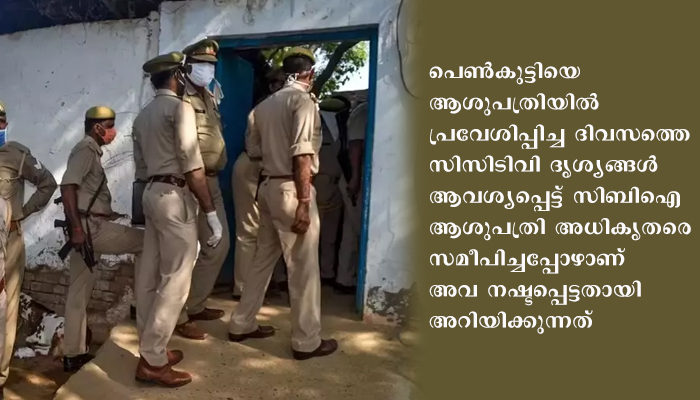 ഇക്കാര്യം അറിയിച്ചത്. ആശുപത്രിയിലെ സിസിടിവി ദൃശ്യങ്ങള് ഏഴ് ദിവസം മാത്രമാണ് സൂക്ഷിക്കുന്നതെന്നാണ് ആശുപത്രി അധികൃതരുടെ വാദം. പെണ്കുട്ടിയെ ആശുപത്രിയില് പ്രവേശിപ്പിച്ച ദിവസത്തെ സിസിടിവി ദൃശ്യങ്ങള് ആവശ്യപ്പെട്ട് സിബിഐ ആശുപത്രി അധികൃതരെ സമീപിച്ചപ്പോഴാണ് അവ നഷ്ടപ്പെട്ടതായി അറിയിക്കുന്നത് .