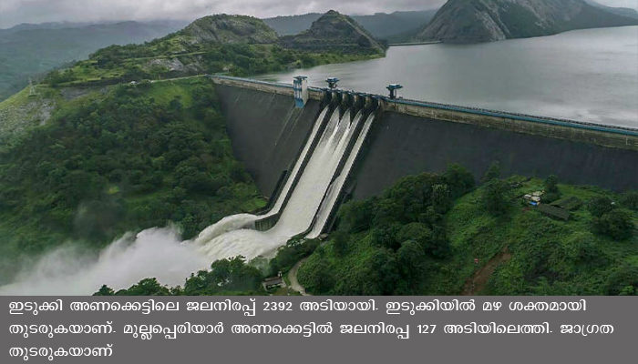 ഇടുക്കി അണക്കെട്ടിലെ ജലനിരപ്പ് 2392 അടി, മഴ തുടരും