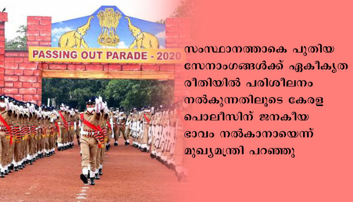 സംസ്ഥാനത്താകെ പുതിയ സേനാംഗങ്ങള്‍ക്ക് ഏകീകൃത രീതിയില്‍ പരിശീലനം നല്‍കുന്നതിലൂടെ കേരള പൊലീസിന് ജനകീയ ഭാവം നല്‍കാനായെന്ന് മുഖ്യമന്ത്രി പറഞ്ഞു. ജനകീയ സേവനത്തിലൂന്നിയുള്ള പരിശീന രീതിക്കാണ് ഇപ്പോള്‍ പ്രാധാന്യം നല്‍കുന്നത്. ഇതിലൂടെ സേനയിലുണ്ടായ മാറ്റം വളരെ വലുതാണ്. കോവിഡ് മഹാമാരിക്കാലത്ത് പരിശീലന സമയത്തു തന്നെ പുതിയ സേനാംഗങ്ങള്‍ക്ക് പൊതുസമൂഹവുമായി അടുത്ത് ഇടപഴകി ജനങ്ങളുടെ ആവശ്യങ്ങള്‍ അറിഞ്ഞ് പ്രവര്‍ത്തിക്കാനായി. ഇതില്‍ നിന്നുള്ള അനുഭവം ഉള്‍ക്കൊണ്ട് കര്‍മ്മമണ്ഡലത്തില്‍ ജനകീയ സേവകരാകാന്‍ കഴിയണം. മുഴുവന്‍ സേനാംഗങ്ങളും പൊതുജന സേവകരാണെന്ന ധാരണയോടെയാണ് ഉത്തരവാദിത്തങ്ങള്‍ നിറവേറ്റേണ്ടത്. അതേസമയം നിയമവാഴ്ചയും ക്രമസമാധാന പാലനവും ഉറപ്പാക്കുന്നതില്‍ വിട്ടുവീഴ്ച പാടില്ലെന്നും മുഖ്യമന്ത്രി ഓര്‍മിപ്പിച്ചു.