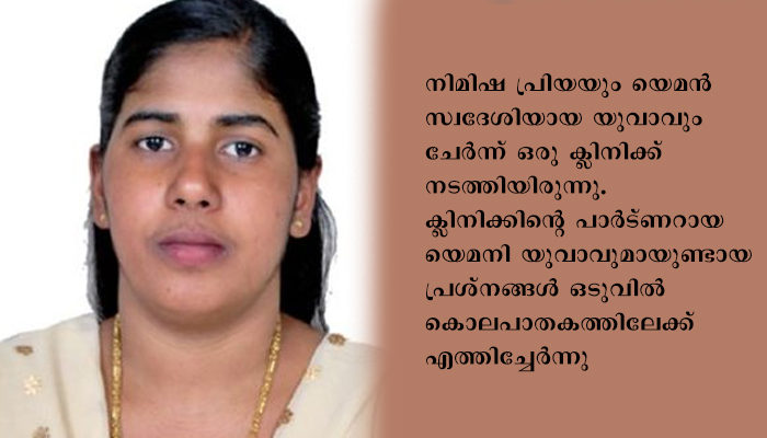 2017 ലാണ് നിമിഷ പ്രിയയ്ക്ക് ജയിൽ ശിക്ഷ ലഭിച്ച സംഭവം നടക്കുന്നത്. നിമിഷ പ്രിയയും യെമൻ സ്വദേശിയായ യുവാവും ചേർന്ന് ഒരു ക്ലിനിക്ക് നടത്തിയിരുന്നു. ക്ലിനിക്കിന്റെ പാർട്ണറായ യെമനി യുവാവുമായുണ്ടായ പ്രശ്നങ്ങൾ ഒടുവിൽ കൊലപാതകത്തിലേക്ക് എത്തിച്ചേർന്നു. യെമൻ യുവാവിനെ വധിച്ച കേസിൽ നിമിഷ പ്രിയ തടവുശിക്ഷ അനുഭവിക്കുകയാണ്.