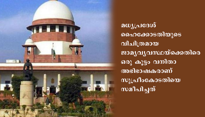 മധ്യപ്രദേശ് ഹൈക്കോടതിയുടെ വിചിത്രമായ ജാമ്യവ്യവസ്ഥയ്ക്കെതിരെ ഒരു കൂട്ടം വനിതാ അഭിഭാഷകരാണ് സുപ്രീംകോടതിയെ സമീപിച്ചത്. സ്ത്രീപീഡനത്തെ നിസാരവൽക്കരിക്കുന്നതാണ് മധ്യപ്രദേശ് ഹൈക്കോടതിയുടെ ജാമ്യവ്യവസ്ഥയെന്നായിരുന്നു ഹർജിക്കാരുടെ വാദം.