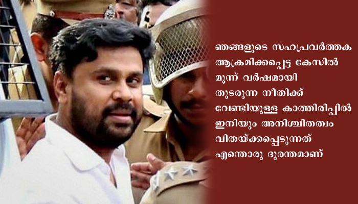 ഞങ്ങളുടെ സഹപ്രവര്ത്തക ആക്രമിക്കപ്പെട്ട കേസില് മൂന്ന് വര്ഷമായി തുടരുന്ന നീതിക്ക് വേണ്ടിയുള്ള കാത്തിരിപ്പില് ഇനിയും അനിശ്ചിതത്വം വിതയ്ക്കപ്പെടുന്നത് എന്തൊരു ദുരന്തമാണ്. ഇക്കാര്യത്തില് പൊതുസമൂഹവും മുഖ്യമന്ത്രിയും അടിയന്തരമായി ഇടപെടണം എന്ന് ഞങ്ങള് അഭ്യര്ത്ഥിക്കുന്നു. നീതിക്ക് വേണ്ടിയുള്ള ഈ ദുസ്സഹമായ കാത്തിരിപ്പിന് അറുതി വരുത്തുകയെന്നത് സര്ക്കാറിന്റെ മാത്രം ഉത്തരവാദിത്തമല്ല. അത് ഈ രാജ്യത്തെ പെണ്കുട്ടികളുടെയും സ്ത്രീകളുടെയും ഭാവിയില് കരുതലുള്ള മുഴുവന് പേരുടെയും ഉത്തരവാദിത്വമായിരിക്കണം എന്ന് ഞങ്ങള് ഓര്മ്മപ്പെടുത്തട്ടെ! എന്ന് wcc പ്രതികരിച്ചു.