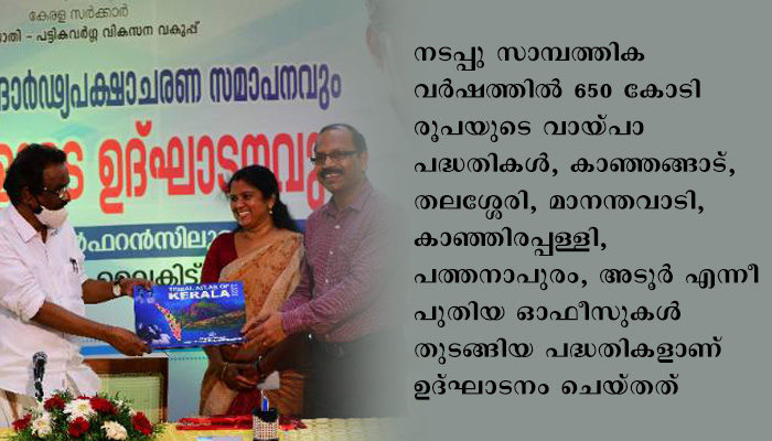 സംസ്ഥാന പരിവര്ത്തിത ക്രൈസ്തവ ശുപാര്ശിത വിഭാഗ വികസന കോര്പ്പറേഷനു കീഴില് കോട്ടയത്ത് മത്സര പരീക്ഷ പരിശീലന കേന്ദ്രം, കോവിഡ് ബാധിച്ച 500 കുടുംബങ്ങള്ക്കുള്ള പ്രത്യേക ധനസഹായ വിതരണം എന്നിവയ്ക്ക് തുടക്കമായി. പട്ടിക വര്ഗ്ഗ വികസന വകുപ്പിനു കീഴില് ഇടുക്കി കോടാലിപ്പാറയില് പോസ്റ്റ്മെട്രിക് ഹോസ്റ്റല്, കാസര്ഗോഡ് ബേഡഡുക്കയില് പ്രീമെട്രിക് ഹോസ്റ്റല്, കുറ്റിക്കോല് പ്രീ-മെട്രിക് ഹോസ്റ്റല്, ഇരിട്ടിയിലുള്ള ആറളം ഫാം ഉല്പന്ന ഷോറൂമായ തണല് മിനി സൂപ്പര് മാര്ക്കറ്റ്, കേരള സ്റ്റേറ്റ് ട്രൈബല് അറ്റ്ലസ് പ്രസിദ്ധീകരണം എന്നിവയാണ് മറ്റു പദ്ധതികള്.