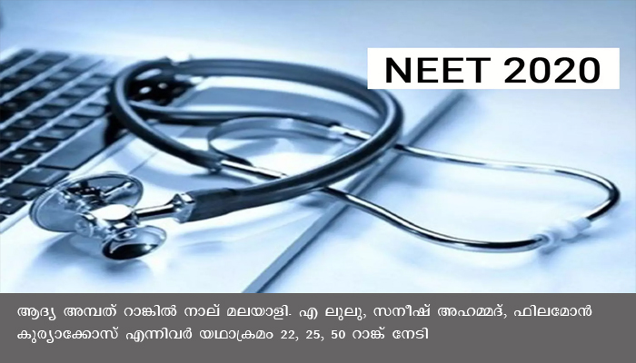 നീറ്റ് ഫലം പ്രസിദ്ധീകരിച്ചു , ആദ്യ 50 റാങ്കിൽ 4 മലയാളികൾ