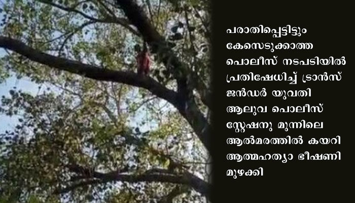 കൊച്ചി: തന്നെ അപമാനിച്ചവർക്കെതിരെ പരാതിപ്പെട്ടിട്ടും കേസെടുക്കാത്ത പൊലീസ് നടപടിയിൽ പ്രതിഷേധിച്ച് ട്രാൻസ് ജൻഡർ യുവതി ആലുവ പൊലീസ് സ്റ്റേഷനു മുന്നിലെ ആൽമരത്തിൽ കയറി ആത്മഹത്യാ ഭീഷണി മുഴക്കി. അന്ന എന്ന ട്രാൻസ് ജൻഡർ യുവതിയാണ് ആത്മഹത്യാ ഭീഷണി മുഴക്കിയത്. ഒടുവിൽ പരാതിയിൽ നടപടിയെടുക്കുമെന്ന് പൊലീസ് ഉറപ്പു നൽകിയതോടെ ഫയർഫോഴ്സ് എത്തി അന്നയെ താഴെ ഇറക്കി.