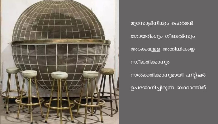 ഭൂഗോളത്തിന്റെ ആകൃതിയിലുള്ള ബാറും അതിലെഅഞ്ച് സ്റ്റൂളുകളുമാണ് ലേലത്തിന് വെച്ചത്.ഹിറ്റ്ലറിന്റെ 3777 അടി നീളമുള്ള യാനത്തിലുള്ള ബാറും സ്റ്റൂളുകളും കപ്പല് പൊളിച്ച നീക്കിയപ്പോഴാണ് മേരിലാന്ഡിലെ ഫാം ഹൗസിലേക്ക് മാറ്റിയത്. 70 വര്ഷമായി അത് അവിടെ ഉണ്ടായിരുന്നു.മുസോളിനിയും ഹെര്മന് ഗോയറിംഗും ഗീബല്സും അടക്കമുള്ള അതിഥികളെ സ്വീകരിക്കാനും സല്ക്കരിക്കാനുമായി ഹിറ്റ്ലര് ഉപയോഗിച്ചിരുന്ന ബാറാണിത്.