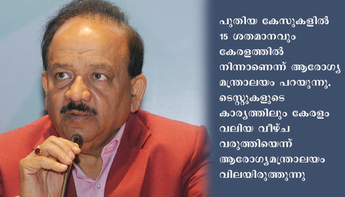 പുതിയ കേസുകളില്‍ 15 ശതമാനവും കേരളത്തില്‍ നിന്നാണെന്ന് ആരോഗ്യ മന്ത്രാലയം പറയുന്നു. ടെസ്റ്റുകളുടെ കാര്യത്തിലും കേരളം വലിയ വീഴ്ച വരുത്തിയെന്ന് ആരോഗ്യമന്ത്രാലയം വിലയിരുത്തുന്നു.