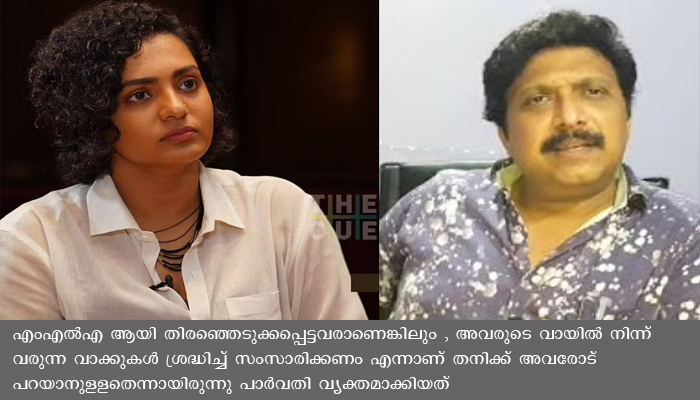 എംഎൽഎ ആയി തിരഞ്ഞെടുക്കപ്പെട്ടവരാണെങ്കിലും , അവരുടെ വായിൽ നിന്ന് വരുന്ന വാക്കുകൾ ശ്രദ്ധിച്ച് സംസാരിക്കണം എന്നാണ് തനിക്ക് അവരോട് പറയാനുളളതെന്നായിരുന്നു പാർവതി വ്യക്തമാക്കിയത്. എംഎൽഎയാണ് പബ്ലിക്കിനെ റെപ്രസെന്റ് ചെയ്യുന്ന ആൾക്കാരാണ്. ഇതിൽ അങ്ങനെ പ്രശ്നമുണ്ടെന്ന് ഉന്നയിച്ച് ഞാൻ രാജിവെച്ച് പോയി എന്ന് പറയുമ്പോൾ ടിആർപി കിട്ടാനും ജീവിച്ചിരിപ്പുണ്ട് എന്ന് കാണിക്കാനും വേണ്ടിയിട്ടാണെന്ന് പറഞ്ഞ എംഎൽഎയാണ് ഗണേഷ് കുമാർ. അതേപോലെ എഎംഎംഎ എന്ന് പറയാൻ പാടില്ല അമ്മ എന്ന് തന്നെ പറയണമെന്നും പാർവ്വതി പറയുന്നു.