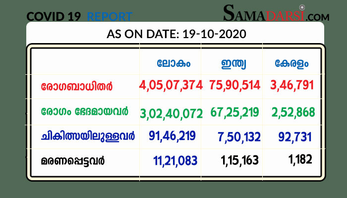 തിരുവനന്തപുരം: കേരളത്തില്‍ 19.10.2020 തിങ്കളാഴ്ച 5022 പേര്‍ക്ക് കോവിഡ്-19 സ്ഥിരീകരിച്ചതായി മുഖ്യമന്ത്രി പിണറായി വിജയന്‍. മലപ്പുറം 910, കോഴിക്കോട് 772, എറണാകുളം 598, തൃശൂര്‍ 533, തിരുവനന്തപുരം 516, കൊല്ലം 378, ആലപ്പുഴ 340, കണ്ണൂര്‍ 293, പാലക്കാട് 271, കോട്ടയം 180, കാസര്‍ഗോഡ് 120, വയനാട് 51, പത്തനംതിട്ട 32, ഇടുക്കി 28 എന്നിങ്ങനേയാണ് ജില്ലകളില്‍ തിങ്കളാഴ്ച രോഗ ബാധ സ്ഥിരീകരിച്ചത്.