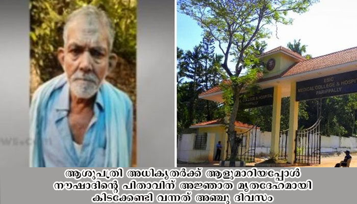 കൊല്ലം പാരിപ്പള്ളി മെഡിക്കല് കോളജിലായിരുന്നു നൗഷാദിൻ്റെ പിതാവ് സുലൈമാനെ പ്രവേശിപ്പിച്ചിരുന്നത്. ഒടുവിൽ മൃതദേഹം കണ്ടെത്തിയത് തിരുവനന്തപുരം മെഡിക്കല് കോളജ് ആശുപത്രിയിലെ മോർച്ചറിയിൽ നിന്ന്.