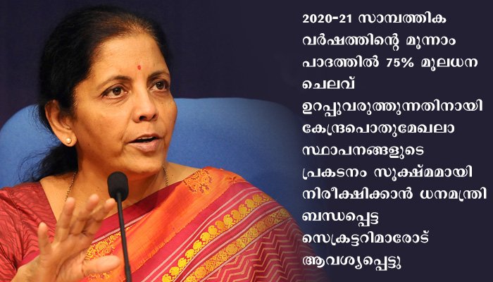 കേന്ദ്ര പൊതുമേഖലാ സ്ഥാപനങ്ങളുടെ മൂലധനച്ചെലവ് സാമ്പത്തിക വളർച്ചയിലെ നിർണായക ഘടകമാണെന്നും, അതിനാൽ 2020-21, 2021-22 സാമ്പത്തിക വർഷങ്ങളിൽ മൂലധനച്ചെലവ് വർദ്ധിപ്പിക്കേണ്ടതുണ്ടെന്നും ശ്രീമതി.സീതാരാമൻ പറഞ്ഞു. 2020-21 സാമ്പത്തിക വർഷത്തിന്റെ മൂന്നാം പാദത്തിൽ 75% മൂലധന ചെലവ് ഉറപ്പുവരുത്തുന്നതിനായി കേന്ദ്രപൊതുമേഖലാ സ്ഥാപനങ്ങളുടെ പ്രകടനം സൂക്ഷ്മമായി നിരീക്ഷിക്കാൻ ധനമന്ത്രി ബന്ധപ്പെട്ട സെക്രട്ടറിമാരോട് ആവശ്യപ്പെട്ടു.