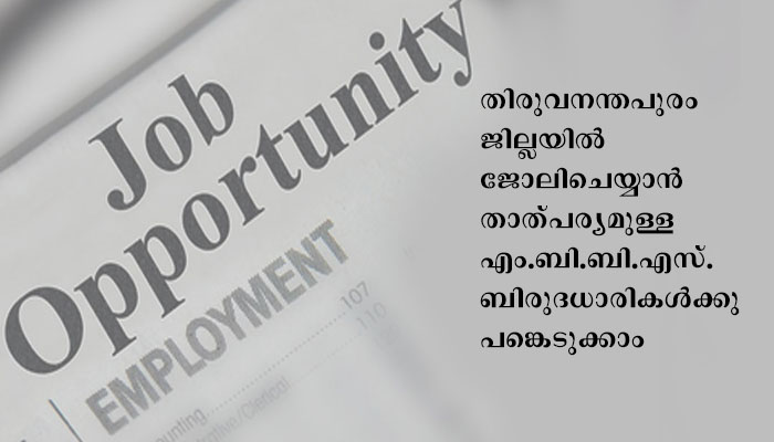 തിരുവനന്തപുരം: ജില്ലാ മെഡിക്കല് ഓഫിസിനു(ആരോഗ്യം) കീഴിലുള്ള സര്ക്കാര് ആശുപത്രികളില് അഡ്ഹോക്ക് വ്യവസ്ഥയില് ഡോക്ടര്മാരെ നിയമിക്കുന്നതിന് ഒക്ടോബര് 23ന് തൈക്കാട് എസ്.എച്ച്.ആര്.സി.(സ്റ്റേറ്റ് ഹെല്ത്ത് റിസോഴ്സസ് സെന്റര്) കോണ്ഫറന്സ് ഹാളില് വാക്ക് ഇന് ഇന്റര്വ്യൂ നടത്തുന്നു. തിരുവനന്തപുരം ജില്ലയില് ജോലിചെയ്യാന് താത്പര്യമുള്ള എം.ബി.ബി.എസ്. ബിരുദധാരികള്ക്കു പങ്കെടുക്കാം. താത്പര്യമുള്ളവര് എം.ബി.ബി.എസ്. ഡിഗ്രി സര്ട്ടിഫിക്കറ്റ്, മെഡിക്കല് കൗണ്സില് രജിസ്ട്രേഷന് സര്ട്ടിഫിക്കറ്റ് എന്നിവയുടെ അസല് സര്ട്ടിഫിക്കറ്റുകളും പകര്പ്പുകളും സഹിതം ഇന്റര്വ്യൂവിനു ഹാജരാകണമെന്നു ജില്ലാ മെഡിക്കല് ഓഫിസര് അറിയിച്ചു. രജിസ്ട്രേഷന് രാവിലെ ഒമ്പതു മുതല് 10 വരെ മാത്രമായിരിക്കുമെന്നും അറിയിപ്പില് പറയുന്നു.