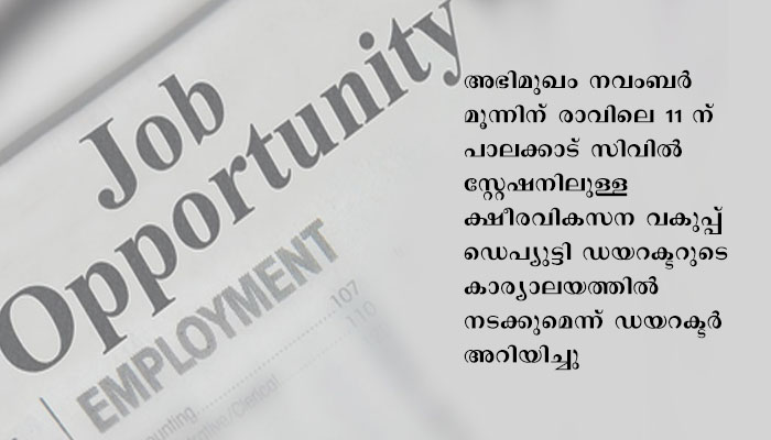 പാലക്കാട്: ജില്ലാ ക്ഷീരവികസന വകുപ്പിന് കീഴില്‍ മീനാക്ഷിപുരം ചെക്‌പോസ്റ്റിലെ പാല്‍ഗുണനിയന്ത്രണ ലാബിന്റെ പ്രവര്‍ത്തനങ്ങള്‍ക്ക് അനലിറ്റിക്കല്‍ അസിസ്റ്റന്റ് (ട്രയിനി) ഒഴിവിലേക്ക് കരാര്‍ നിയമനം നടത്തുന്നു. 24 മണിക്കൂറും പ്രവര്‍ത്തിക്കുന്ന ലബോറട്ടറിയില്‍ 3 ഷിഫ്റ്റുകളിലും ജോലി ചെയ്യാന്‍ അപേക്ഷകര്‍ സന്നദ്ധരാകണം. നിലവില്‍ രണ്ട് ഒഴിവുകളാണുള്ളത്. പ്രതിമാസ വേതനം 17,500/- രൂപ, യോഗ്യത – MSC Chemistry / Biochemistry / Biotechnology, പ്രായം 18 നും 35 നും ഇടയില്‍. ബയോഡാറ്റ,  യോഗ്യത സര്‍ട്ടിഫിക്കറ്റ്, തിരിച്ചറിയല്‍ കാര്‍ഡ് എ്ന്നിവയുടെ പകര്‍പ്പുകള്‍ സഹിതം അപേക്ഷ ഒക്ടോബര്‍ 28 ന് വൈകീട്ട് അഞ്ചിന് മുമ്പായി നേരിട്ടോ തപാല്‍ മുഖേനയോ ഡെപ്യുട്ടി ഡയറക്ടര്‍, ക്ഷീരവികസന വകുപ്പ്, സിവില്‍സ്റ്റേഷന്‍, പാലക്കാട് എന്ന വിലാസത്തില്‍ സമര്‍പ്പിക്കണം. കൂടിക്കാഴ്ചക്ക് യോഗ്യത നേടിയവരുടെ ലിസ്റ്റ് ഒക്ടോബര്‍ 30 ന് രാവിലെ പതിനൊന്നിന് ഓഫീസ് നോട്ടീസ് ബോര്‍ഡില്‍ പ്രസിദ്ധപ്പെടുത്തും. അഭിമുഖം നവംബര്‍ മൂന്നിന് രാവിലെ 11 ന് പാലക്കാട് സിവില്‍ സ്റ്റേഷനിലുള്ള  ക്ഷീരവികസന വകുപ്പ് ഡെപ്യുട്ടി ഡയറക്ടറുടെ കാര്യാലയത്തില്‍ നടക്കുമെന്ന് ഡയറക്ടര്‍ അറിയിച്ചു.